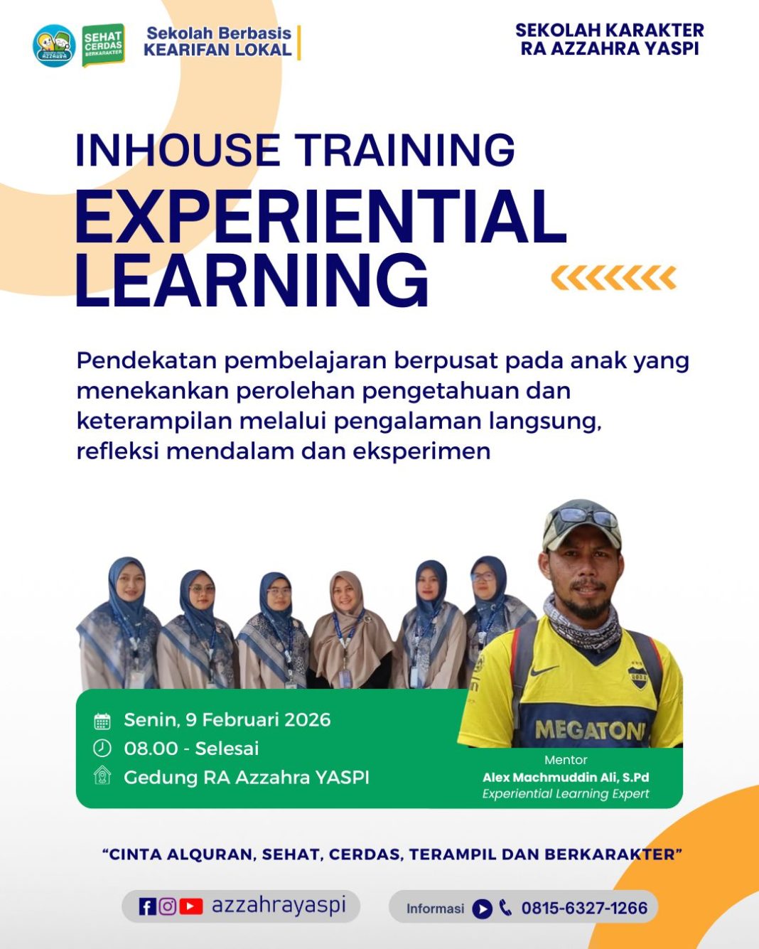CANTAYAN, SUKABUMI (9 Februari 2026) – Sekolah Karakter RA Azzahra Yaspi Cantayan kembali mempertegas identitasnya sebagai lembaga pendidikan inovatif melalui penyelenggaraan In-House Training (IHT) bertajuk “Experiential Learning”. Kegiatan ini diikuti oleh seluruh tenaga pendidik guna memperkuat metode pembelajaran yang selama ini telah menjadi ciri khas dan bagian tak terpisahkan dari kurikulum RA Azzahra.