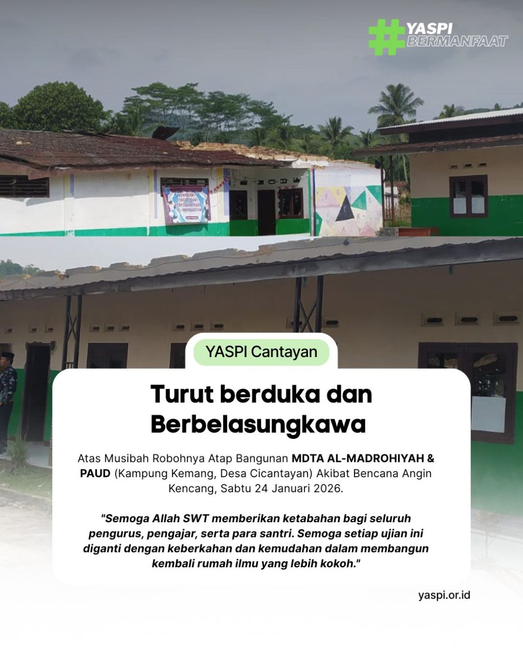 Kunjungan ini merupakan respons cepat atas musibah yang menimpa MDTA Al-Madrohiyah dan PAUD pada Sabtu (24/01) lalu. Akibat terjangan angin kencang, struktur atap bangunan madrasah dan ruang kelas PAUD mengalami kerusakan berat hingga roboh. Kejadian ini meninggalkan kesedihan mendalam, mengingat bangunan tersebut merupakan tempat bernaung anak-anak Kampung Kemang dalam menimba ilmu.