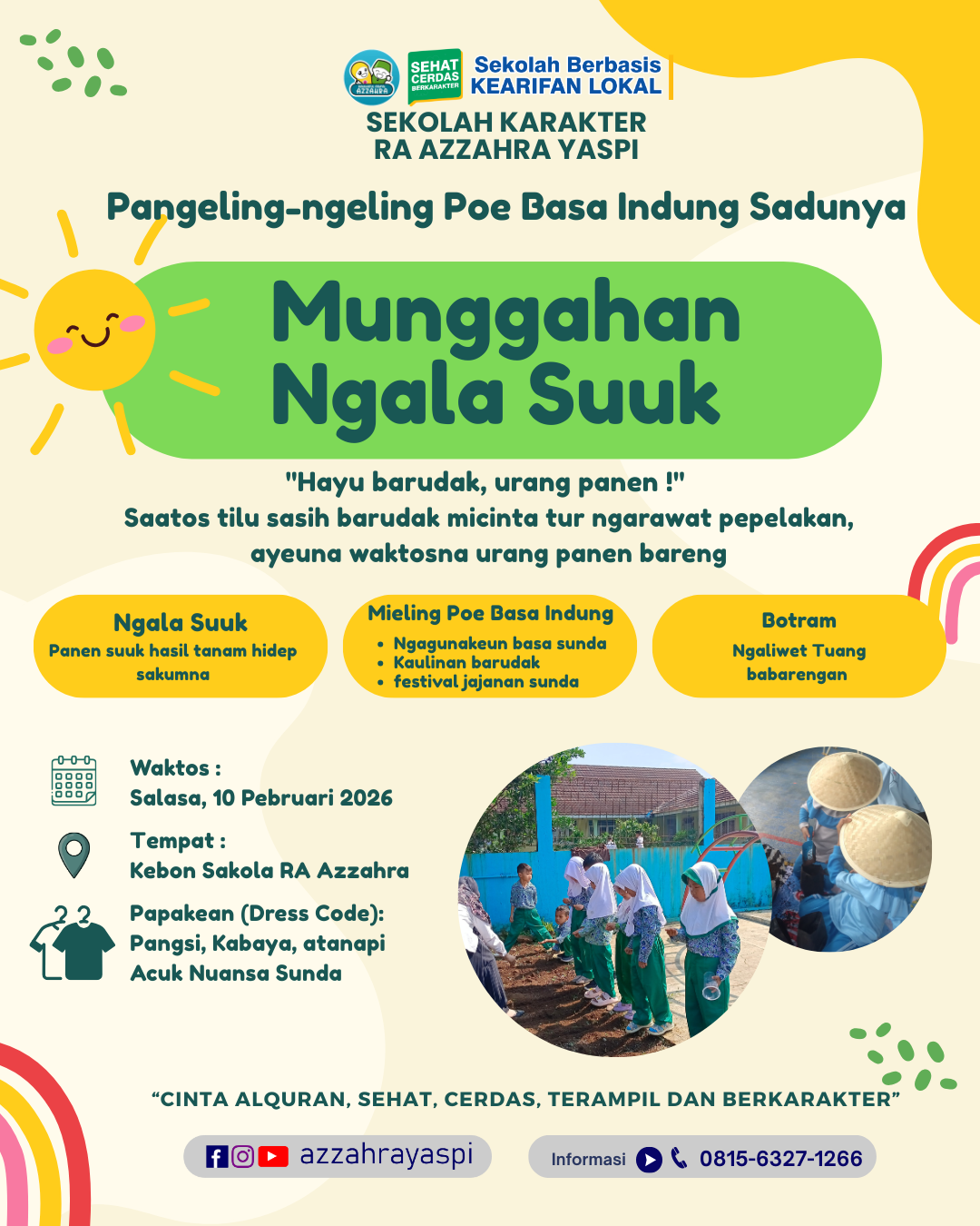 CANTAYAN, SUKABUMI – Menyambut datangnya bulan suci Ramadan sekaligus memperingati Poe Basa Indung Sadunya (Hari Bahasa Ibu Internasional), Sekolah Karakter RA Azzahra Yaspi menyelenggarakan kegiatan edukatif bertajuk “Munggahan Ngala Suuk” pada Selasa, 10 Februari 2026. Acara yang berlangsung di Kebon Sakola RA Azzahra ini menjadi momentum penting bagi para siswa untuk memanen hasil belajar mereka langsung dari alam.