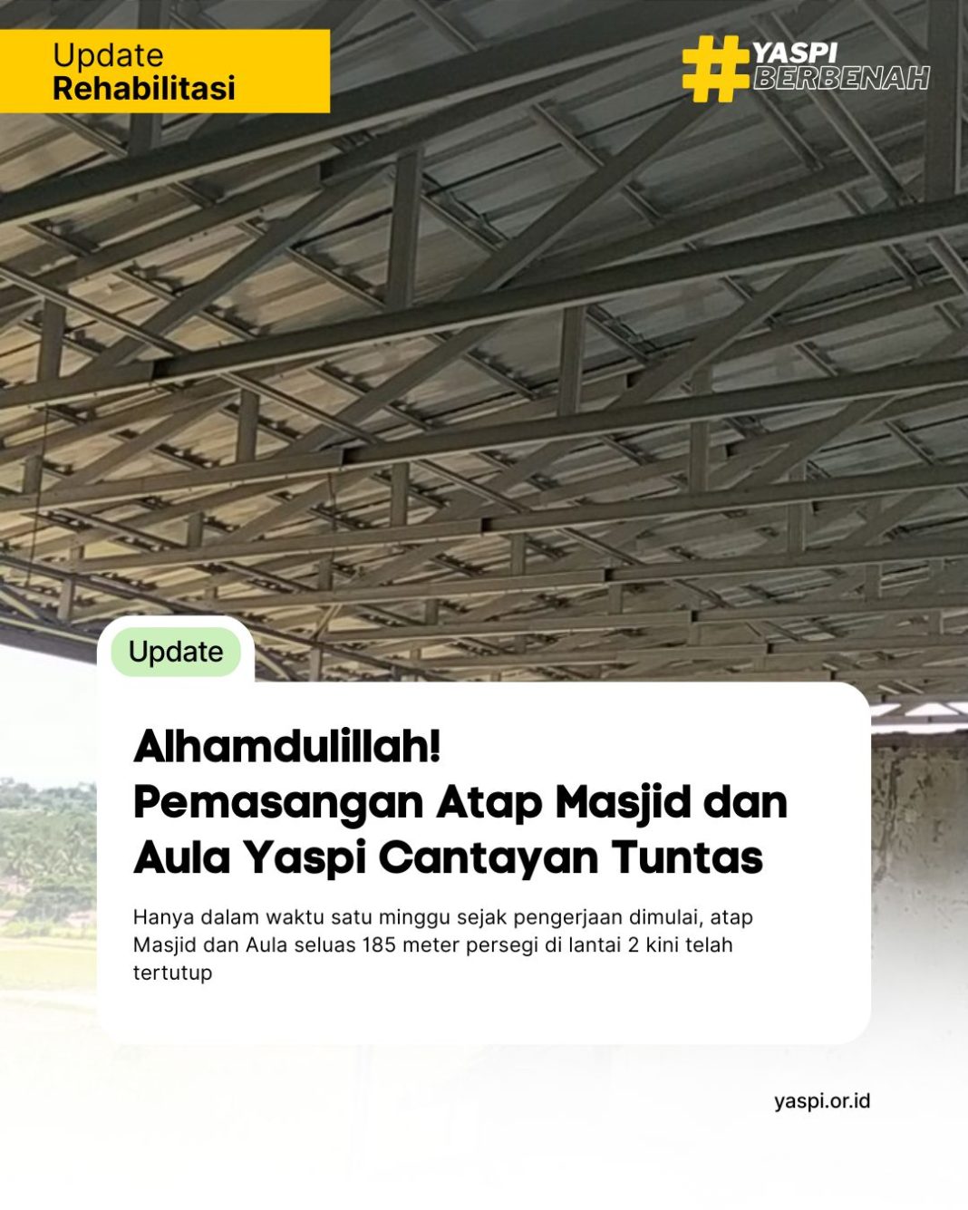 CANTAYAN, SUKABUMI – Sabtu, 24 Januari 2026, menjadi tonggak penting dalam proses rehabilitasi Yayasan Yaspi Cantayan. Hanya dalam waktu satu minggu sejak pengerjaan dimulai, atap Masjid dan Aula seluas 185 meter persegi di lantai 2 kini telah tertutup sempurna. Proyek strategis ini berhasil diselesaikan untuk mengamankan fasilitas vital di lantai bawah dari ancaman hujan.