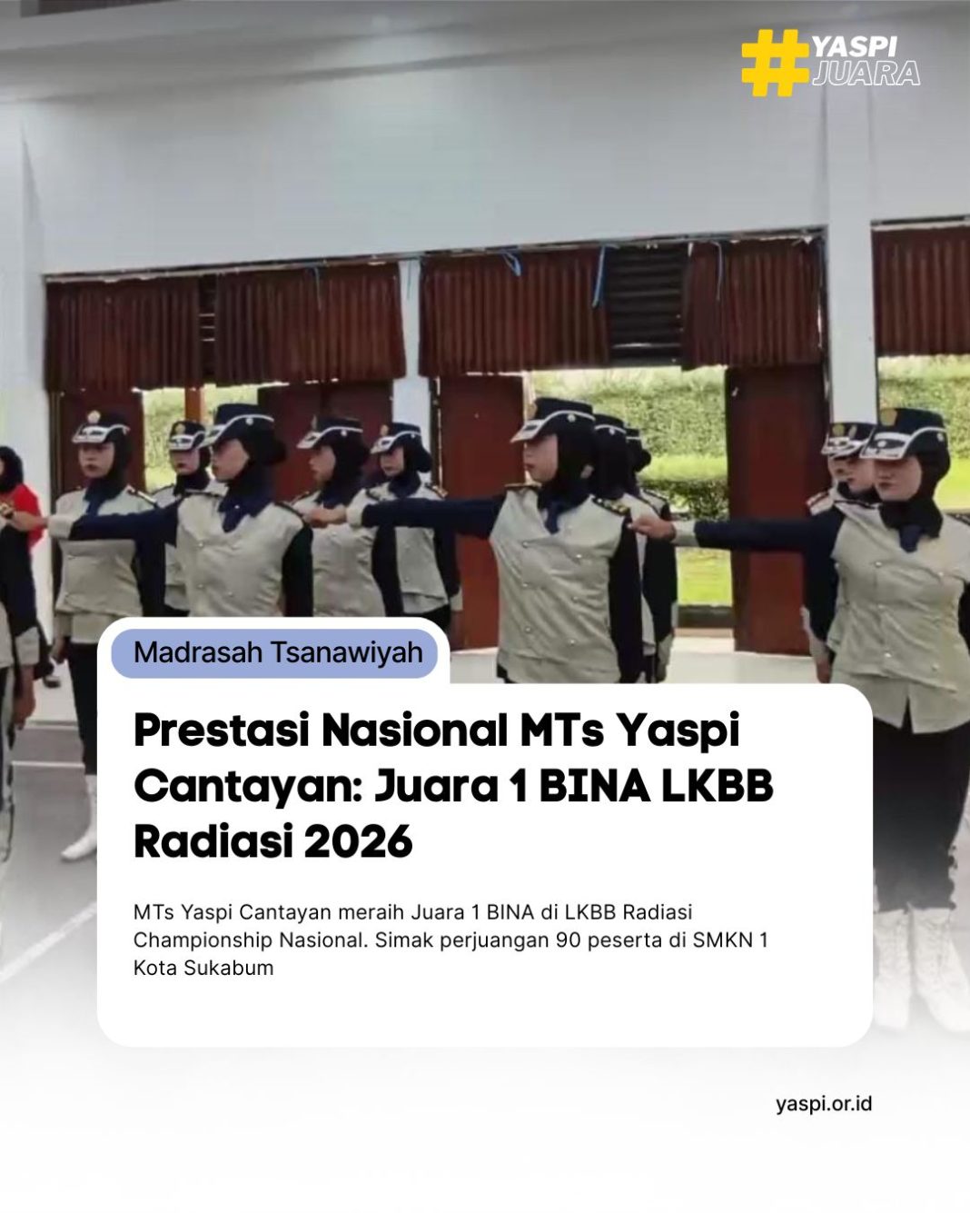 SUKABUMI – Madrasah Tsanawiyah (MTs) Yaspi Cantayan kembali menorehkan tinta emas di kancah nasional. Pada ajang bergengsi LKBB Radiasi Championship Tingkat Nasional yang diselenggarakan di SMKN 1 Kota Sukabumi, Sabtu (7/2/2026), tim Paskibra MTs Yaspi Cantayan berhasil menyabet gelar Juara 1 BINA.