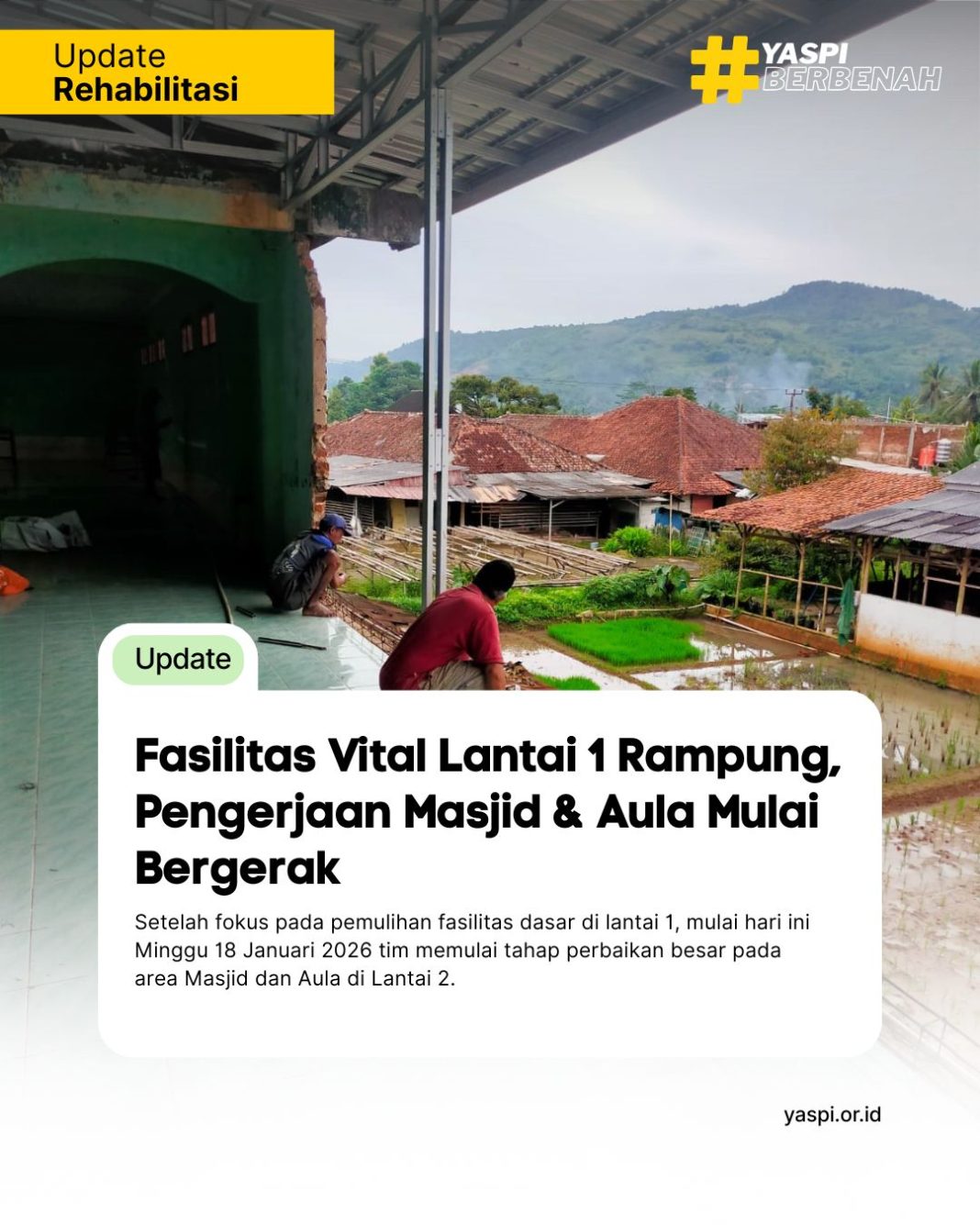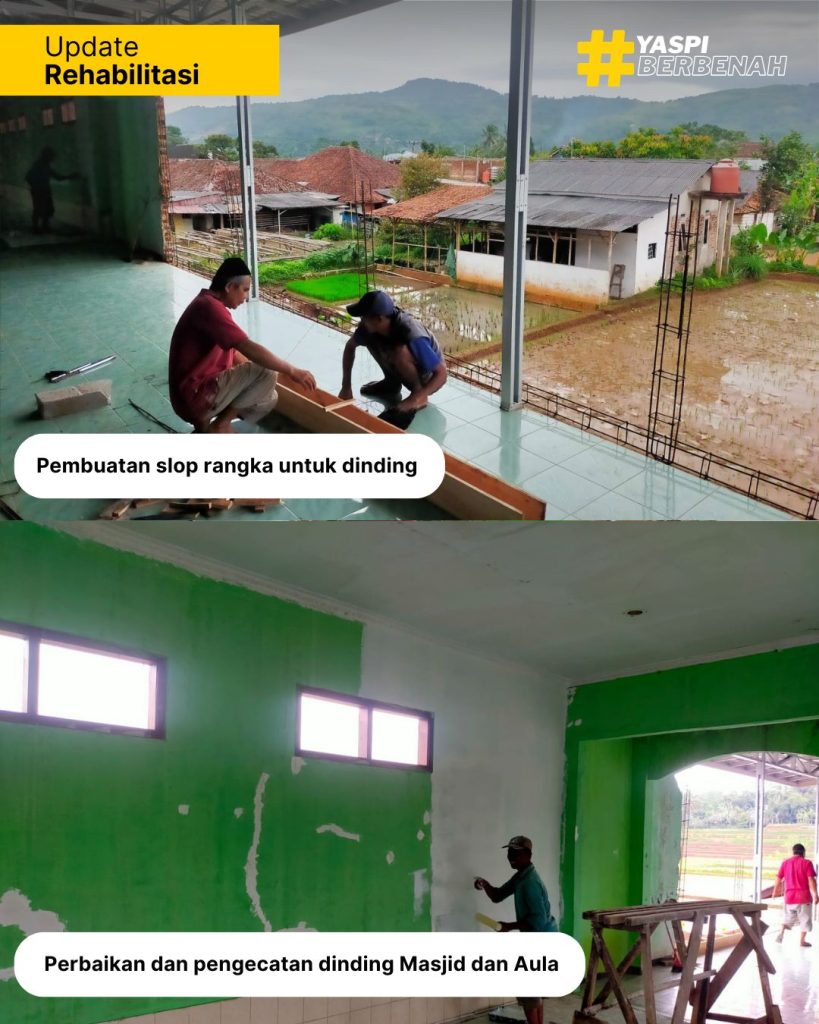 CANTAYAN, SUKABUMI – Langkah pemulihan Yayasan Yaspi Cantayan pasca-bencana tanggal 4 Desember 2025 menunjukkan progres yang menggembirakan. Setelah berhasil menuntaskan perbaikan vital di lantai 1, tim kini bergerak intensif melakukan renovasi di lantai 2 yang mencakup area Masjid dan Aula Utama.
